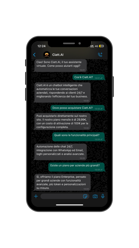 A luglio 2024, Ciatt.AI integra WhatsApp, ampliando le possibilità di interazione diretta con i clienti. Ora puoi automatizzare conversazioni e gestire richieste su una delle piattaforme di messaggistica più popolari, migliorando l’efficacia e la portata del tuo supporto clienti.